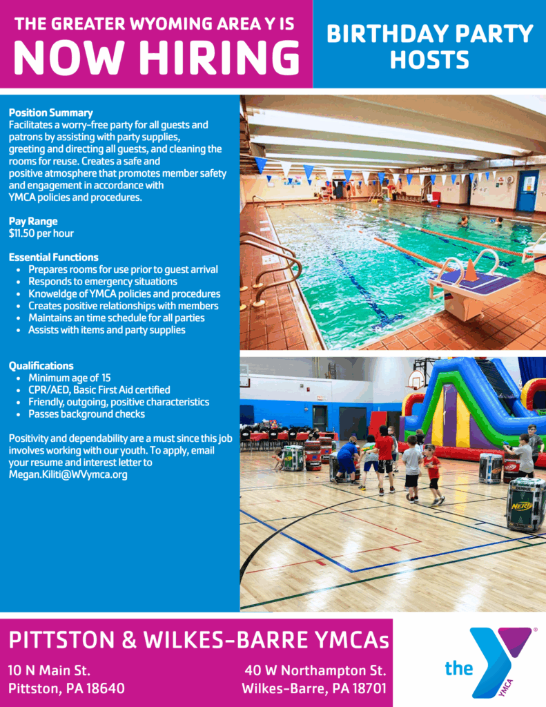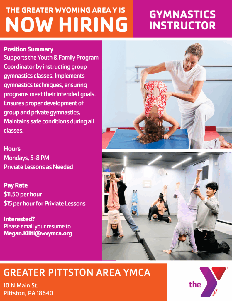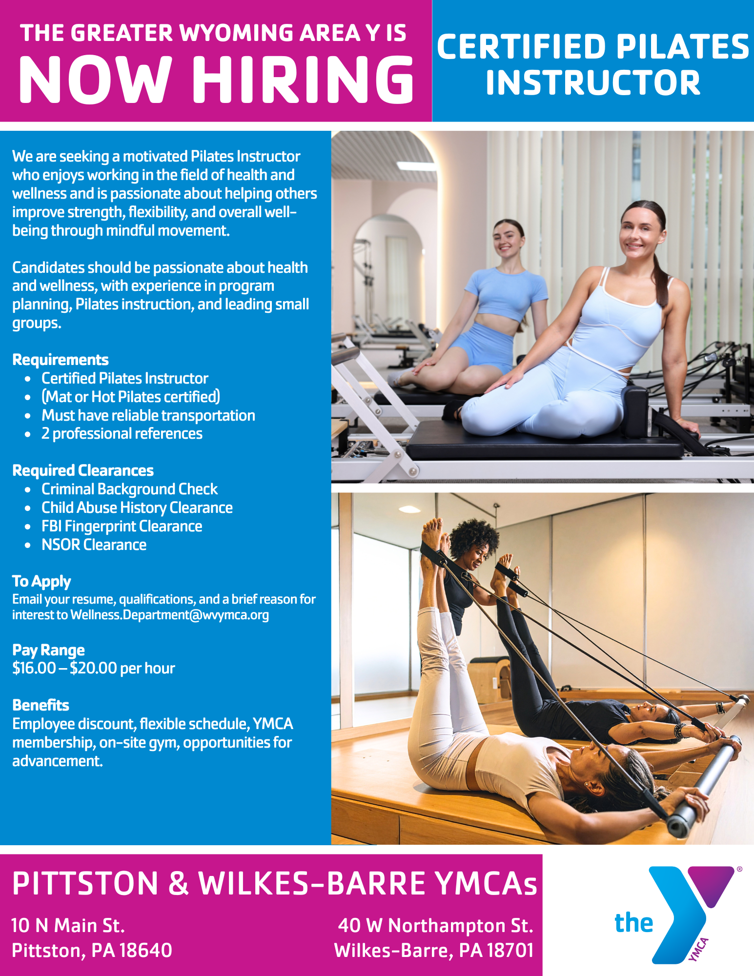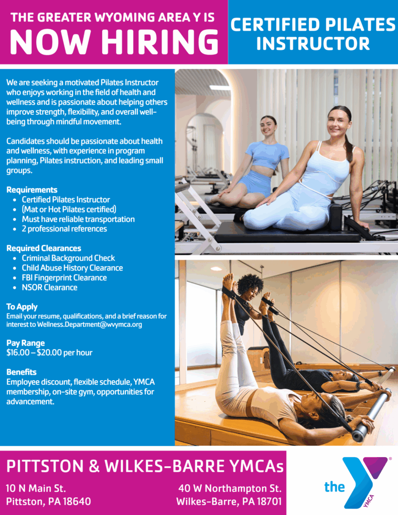 Are you interested in a flexible work schedule, free gym membership, discount on childcare and other Y programming, opportunities for private sessions, and reimbursement on future certifications? Then the Greater Wyoming Valley Area YMCA has opportunities for you. We are seeking a motivated Pilates Instructor who enjoys working in the field of health and wellness and is passionate about helping others improve strength, flexibility, and overall well-being through mindful movement.