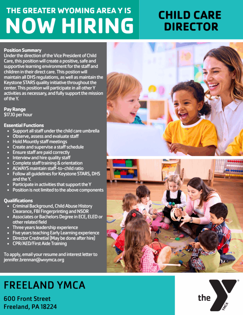 Our child care programs are always seeking energetic, educated and caring staff to create a positive, safe and supportive learning environment for the children in their direct care. Child care employees report directly to the Child Care Director at their respective location. These positions require four clearances (Criminal Background Check, Child Abuse History Clearance, DHS Fingerprinting and NSOR) and a minimum of a high school diploma with two years of child care experience. Child care staff are required to maintain proper classroom management, communicate with parents and directors, and ensure that all children are safe at all times. Full time and part time positions available. Salary is based on education, educational goals and experience. Positions are available at our four child care centers, under the Greater Wyoming Valley Area YMCA Association, so please specify location of interest on your application. View full description.