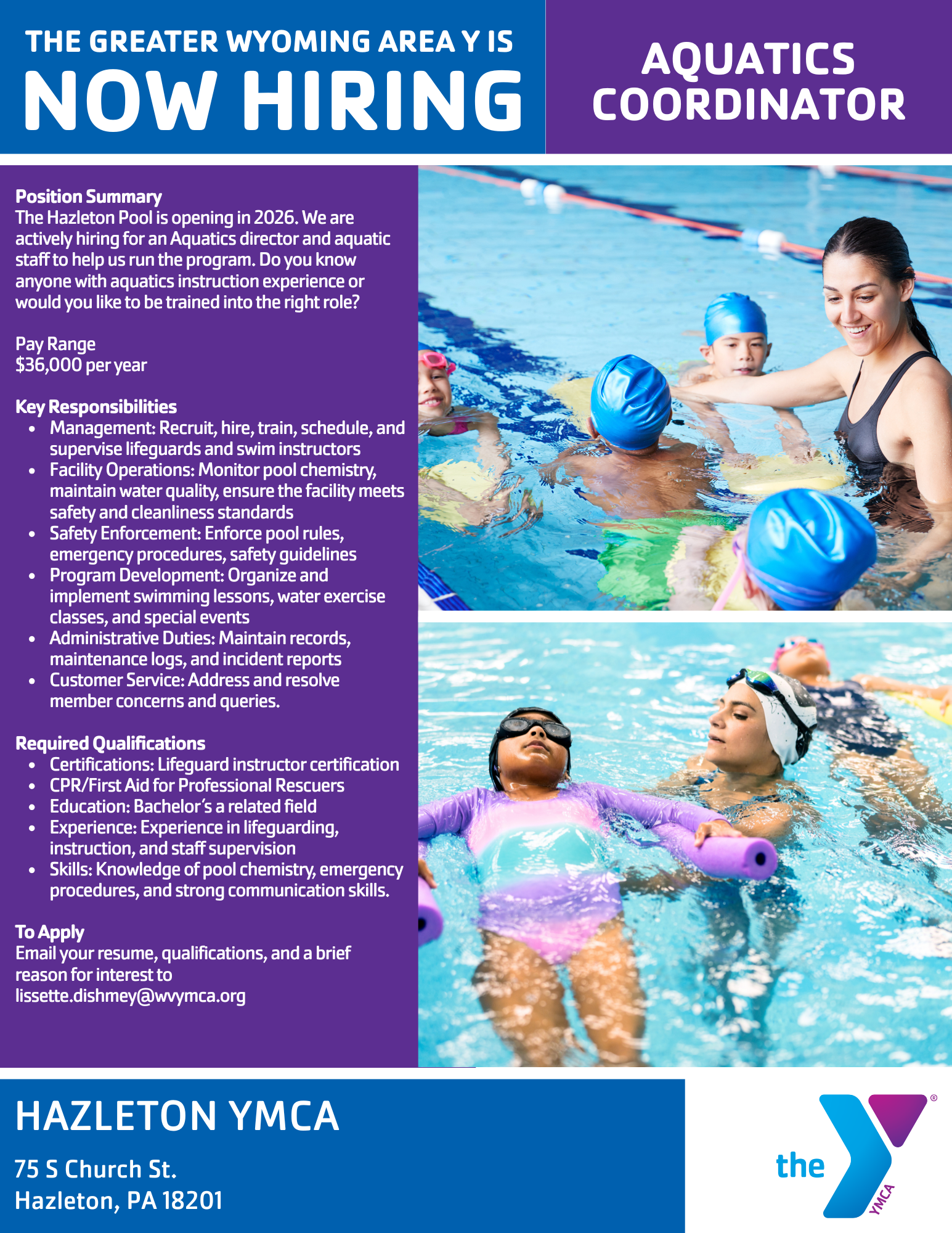 Apply today and let us know what works for you. Dependability is a must so that the pool may be open during all operating hours.